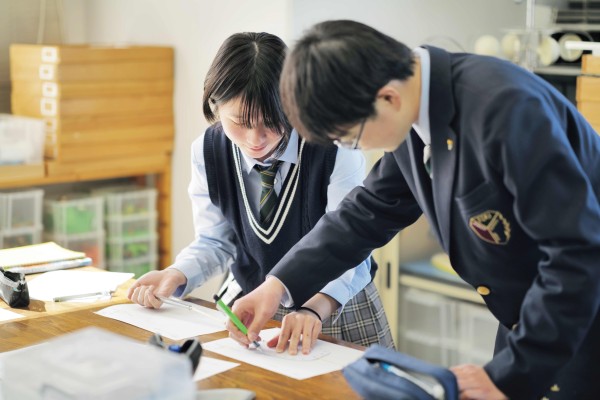 情報教育は開校当初から行われています。初歩的なブロック型のビジュアルプログラミングから始まり、高校1年生までにVBA(Excel内の言語)やPC言語を用いたプログラミングの基礎まで学べます。1 人1 台のタブレットPCは、「情報」以外の授業にも広く活用されています。2021年度からは独自教科「探究」を設け、課題発見と解決の実践を通して、これからの時代に必要な「5つの力(左図)」を育成しています。