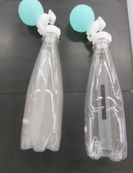 江戸女では理科の実験を多く取り入れており、教科書に載っている実験はほぼすべて行っています。中2ではペットボトルの中に雲を作りました。雲は水蒸気が水滴に変わったものなので、湿らせたペットボトル内の気圧を一気に下げて空気を膨張させると、ペットボトル内の気温が下がって雲が出来ます(写真左)。実験では専用の実験器具を使いましたが、おうちにあるものでも出来るのでぜひやってみてください!
