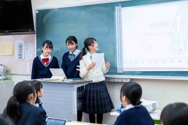 説明会では、毎回生徒発表があります。学校生活の紹介として、学校行事やクラブ活動の様子、志望校選びや受験のことなど、自分の言葉でプレゼンします。パワポのスライドも生徒が作り、生き生きとした学校生活が伝わります。学年教師とのやりとりもサプライズの質問にも応え、生徒と教師の距離感も感じてもらえます。入学後の1年さき、2年さきのお嬢様の中学生としての姿をイメージしていただけます。