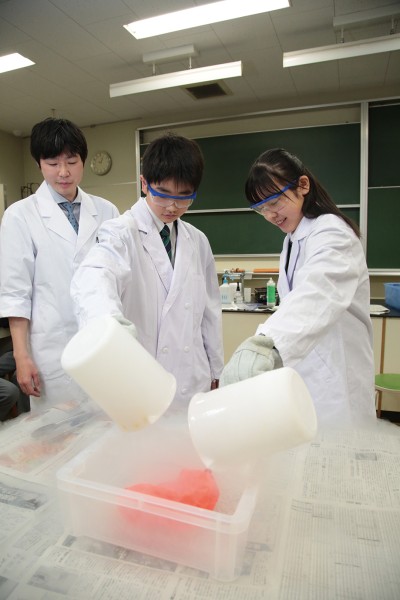 中学1,2年生では、週4時間の理科の授業とは別の枠組みで週1時間「理科実験」を実施しています。生徒にとって身近なもの、見たことがあるものを使って、興味・関心をより引き出すようなダイナミックな実験を行います。日常にひそむ科学を取り扱うことで、幅広い視点で自然現象を見る目を育て、現象について深く考える力が身につきます。