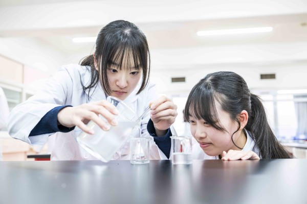 東京家政学院では、理科室をリニューアルしました。その名も「化学生物研究室」。とにかく明るくて女子校らしく華やかに、赤とピンクを取り入れました。校章にも使用されている家政学院カラーの理科室です。最新の実験器具もひとり1台揃っており、大変好評です。管理栄養進学コースと理系を選択した生徒は、本校オリジナルマークが印刷された特注の白衣を羽織って「化生研」で実験します。