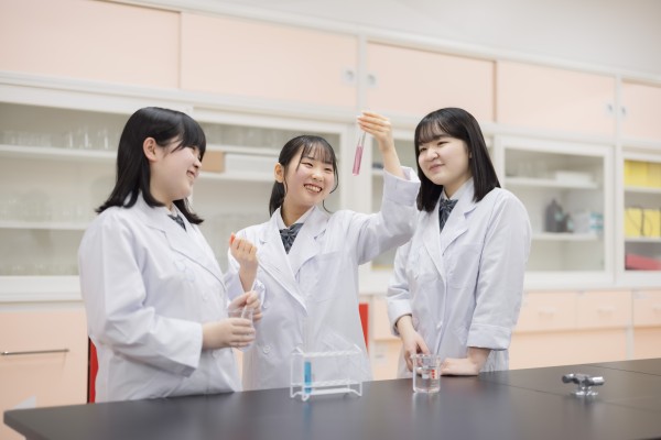 東京家政学院では、理科室をリニューアルしました。その名も「化学生物研究室」。とにかく明るくて女子校らしく華やかに、赤とピンクを取り入れました。校章にも使用されている家政学院カラーの理科室です。最新の実験器具もひとり1台揃っており、大変好評です。管理栄養進学コースと理系を選択した生徒は、本校オリジナルマークが印刷された特注の白衣を羽織って実験します。
