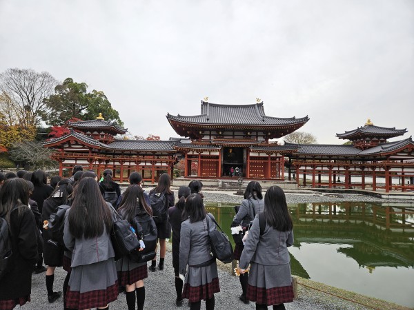 中学2年の12月に奈良・京都歴史学習を行います。奈良では東大寺、法隆寺などを訪問します。京都では平等院鳳凰堂を訪れるほか、友禅染体験やタクシーを利用して班別自習行動を行います。事前学習で一つ一つていねいに見学地を調べ、知識をしっかり頭に入れてから現地に向かいます。また、班別自習行動では昼食も各班で取るため、京都ならではのお食事がいただけるレストランも入念に探します。