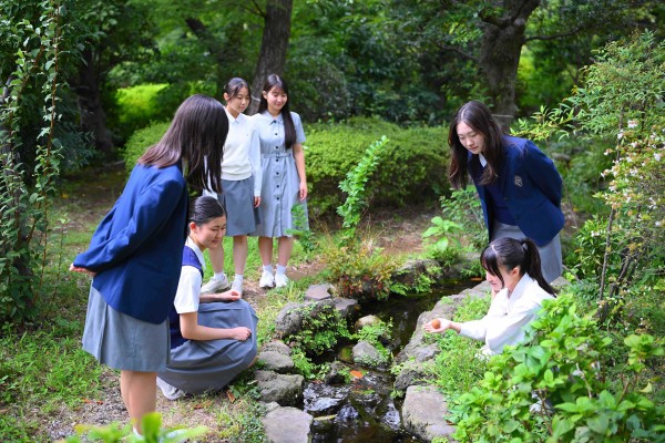 東急大井町線・池上線旗の台駅から徒歩5分、校門からの風景は学校とは思えないでしょう。ある実業家の邸宅をそのまま校地としているので、校門から築山と呼ばれる庭園を抜けて校舎にたどり着きます。築山は、理科の自然観察や国語の創作の場であったり、休み時間は生徒達の憩いの場ともなっています。四季折々の花々を楽しめるキャンパスで6年間過ごし、香蘭生の心は豊かに育っています。
