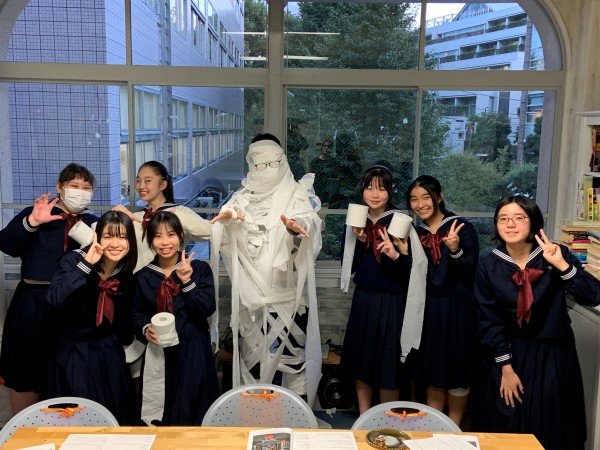 実践女子のReturnee Crossroads は、海外在留経験者が集まって話をしたり、経験を生かした学びを行ったりする交流の場です。10 月にはハロウィン・パーティーを行い、アメリカの定番ゲームであるMummy Race(トイレットペーパーを使ったミイラ競争)を楽しみました。