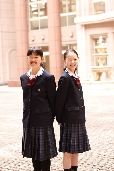 2年前に制服をリニューアルしました!中学生はセーラー服風の大きめの襟とえんじ色のリボンがポイントです。リュックを背負う生徒が多いため、邪魔にならないように後ろの襟はすっきりとしたデザインにしてあります。ブレザーは中高共通のノーカラータイプ(襟無し)です。ポロシャツとスラックスも導入し、選択できるアイテムが増えました。機能性もアップした制服は生徒たちに大好評です!