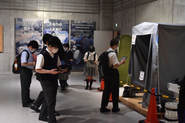 国士舘は「災害時に強い人材育成」を学園全体で目指しています。中学校は、より多くの身体的経験が将来に備える糧になると考えています。毎年行う防災学習ですが、今年度は東京臨海広域防災公園・そなエリアにて、世田谷区及び東京消防庁の協力も得て、大規模に実施しました。そなエリアに設けられた防災体験学習ツアー「東京直下72hTOUR」を中心に、体験や訓練を7種。昼食も非常食をいただきました。