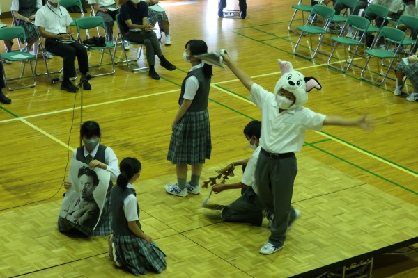 今まで学んできた英語を使って、グループで協働して作品を創り、発表する行事です。人前で英語で発表することは、よい経験と自信になります。昨年はキャラクターや有名な人物を1 人選び、英語で紹介しました。
