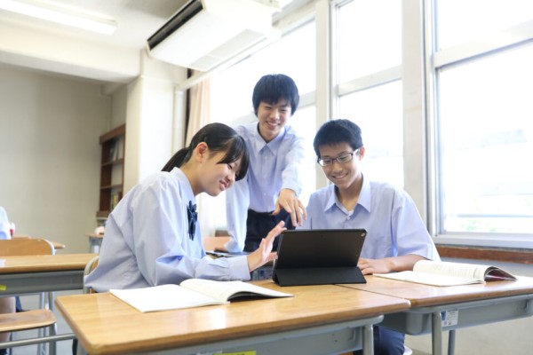 部活動にも全力で取り組む生徒たちをしっかりサポートするため、短い時間でも有効に学習できる環境として、パソコンやタブレット端末が利用できる環境を整えています。毎日の学習や部活動に取り組む姿勢など、多くの教員の目で見た生徒の状態や試験の結果、自宅学習の様子等の記録を「ポートフォリオ」として生徒、教員がタブレット端末に残し、学びの振り返りの中で、一人ひとりの成長を期待します。また大型モニターを活用することにより、直接、生徒との触れ合いや会話の時間を増やし、より適切な学習指導や進路指導を実現します。