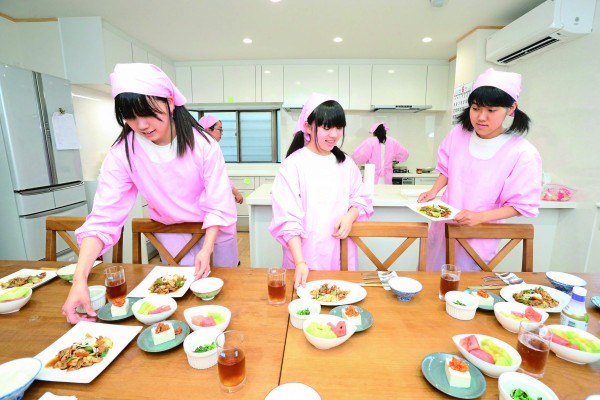 また文華の伝統教育として、学校の敷地内にある家庭教育寮で2泊3日の実習を行います。お客様の分も含めた食事の用意、材料の買い物、お弁当作り、掃除、お客様のおもてなしなど、家事全般とおもてなしを、7~8名の班で協力しながらすすめていきます。将来自宅を離れても、自分の力で規則正しく健康的な生活を送ることができるよう、実践を通して自立力を養う、文華女子独自の教育です。