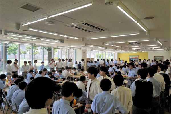 本校は基本的にはお弁当持参ですが、食堂はいつも満席。唐揚げやポテトを買って、お弁当と一緒に食べる生徒がたくさんいます。この食堂は高校生の先輩たちも使いますが、入りづらい雰囲気はなく、中1から高校生まで生徒全員気兼ねなく利用しています。先輩後輩の仲が良く、フレンドリーな本校の雰囲気そのままの景色がここにあります。