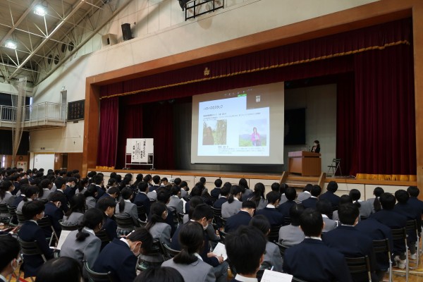 高校受験がない分、早期からじっくりと自分の将来について考えます。今年度は、講演会としてNPO法人ハロハロ事務局長 成瀬 悠さんをお招きして、「世界とともに生きる」と題し、フィリピン青少年の奉仕活動の事例を参考に、その活動内容や将来の社会への関わり方について講演していただきました。中2での出張授業や中3での卒業生が語る会、大学訪問も一人ひとりが進路実現に向けて考える良い機会となります。