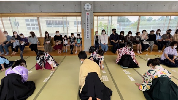 昨年度競技かるた部が、創部7年目にして、なんと近江神宮で行われた全国大会に出場しました。大会出場選手は7名そのうち6名が中学校からの部員(女子5名、男子1名)です。まさに漫画『ちはやふる』の世界を体現しています。文化祭=輝緑祭では、はかま姿の彼らの雄姿を間近で見ることもでき、来場者はその迫力に圧倒されていました。