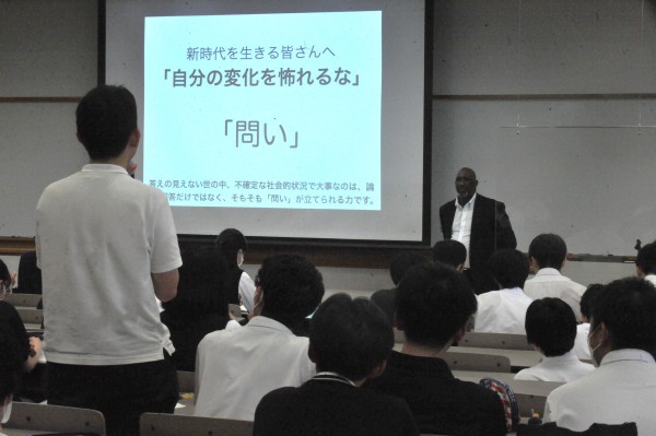さまざまな分野の第一線にいる方々を招く「大学訪問授業」を年間約20回程度実施。 写真は京都精華大学前学長のウスビ・サコ先生。テーマは「これからの世界」を生きる君に伝えたいこと」。これまでに ノーベル化学賞の根岸英一氏、音楽家坂本龍一氏、ジャーナリスト池上彰氏、棋士の羽生善治氏などが講演。桐光生であれば誰でも参加でき、進路選びのきっかけになる生徒も多数います。