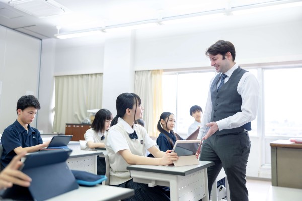 本校ではネイティブの先生による授業が数多くあり、楽しく英語を使いながらリスニング力やスピーキング力を伸ばします。毎週行う単語テストや文法の授業では、ICT教材も活用して基礎力を磨いています。色んな角度から英語に触れる機会を持つことで、ハードルが自然と下がり、前向きに英語を学べる環境を作っています。校内全員受検により、英検の取得率もぐんと上がってきています!