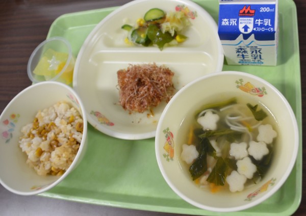 中高6年間、学園内の厨房で産地を厳選した食材を使って手作りされている、栄養価が高くバランスの取れた食事をいただきます。行事にちなんだ献立もあり、昨年の七夕の日のメニューは、コーンの星が降る焼きとうもろこしご飯、天の川に見立てたそうめんに星形の麩が浮かんだおすまし、星型のゼリーを使ったフルーツポンチでした。食材や、いただくまでの過程で携わっている方々への感謝の気持ちも育んでいます。