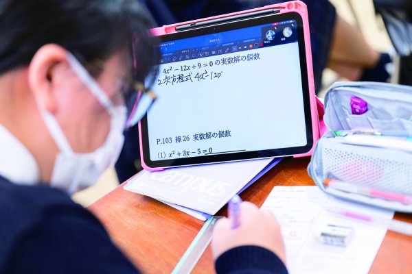 1人1台の端末(iPad)を使用して授業を行っています。校内のICT環境も整備され、学習用アプリ(スタディサプリ)や、授業支援システム(Google classroom)などを用いた効率的かつそれぞれのレベルに合わせた学びを実現しています。