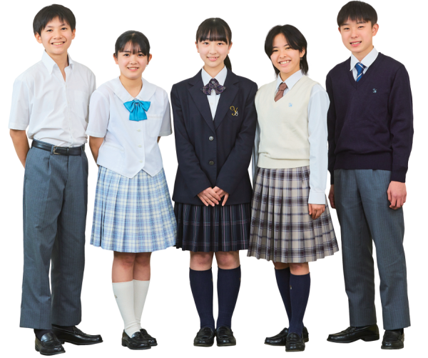 紺色のジャケットに男子はグレーのズボン、女子はウィンドペンのチェック柄のスカート。シャツは5色あり、組み合わせが楽しめます。その他のアイテムも豊富でその日の気分に合わせたコーディネートができます。夏服は半袖シャツに男子はズボン。女子はセーラーカラー風のブラウスにスカートで爽やかさが感じられます。生徒たちにも人気の制服です。