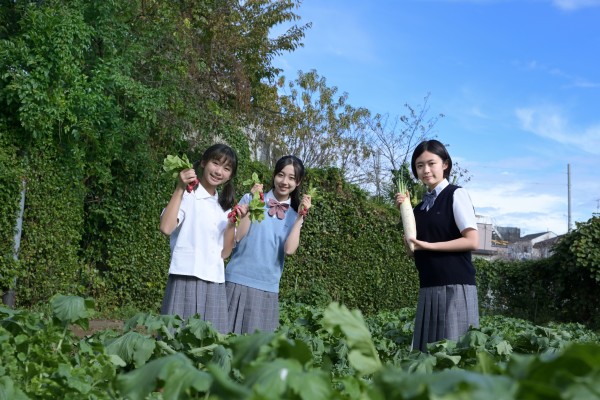 本校は世田谷区の住宅街にありながら、植物や木々が生い茂り、のびのびとした環境です。園芸の授業で使用する農園や、流れの小径というビオトープ、大きく美しい藤棚などがあります。園芸の授業では、生徒は農園で種まきから野菜を育てて、自宅でサラダにして無農薬野菜を頬張っています。今の季節は新緑が美しく、晴れた日にはぽかぽか陽気のなか、元気に外を走り回る中1もいます。