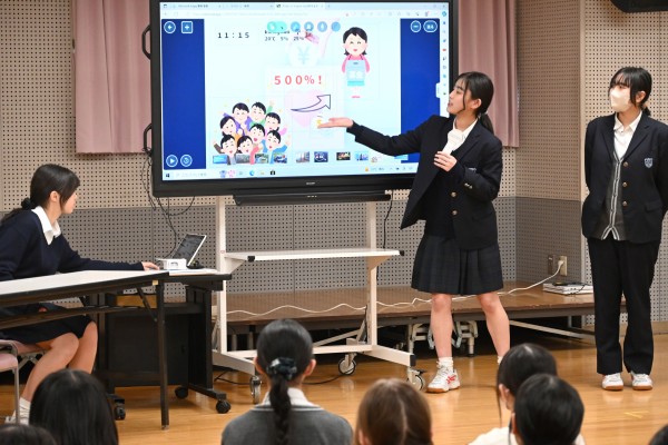 「English Day」は英語での研究発表会です。中1は社会科とコラボして日本文化を紹介。中2では非英語圏の方をゲストに招いて英語でインタビュー。中3では海外の社会問題について調べます。約2ヶ月かけて準備し、本番ではグループごとにプレゼン発表!目標は自分の言葉で自由に発信できる「使える英語」を習得することです。年々英語スキルも発表力も聴く力もアップします。