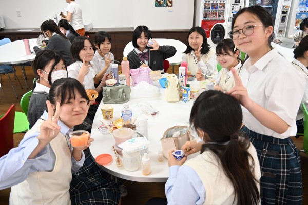基本生徒はお弁当を持参し、教室で昼食を食べますが、地下の「ときcafé」で食べる生徒も。何と電子レンジ2台完備!お弁当を温められます。購買では揚げたてのからあげ(3コ入り)がおすすめ。軽食のおにぎりやパンはもちろんワンタン麺やカップはるさめがあり、お湯を入れて教室まで運んでいるうちに3分!身体の芯から温まります。自販機ではカップの飲み物「ココア」が人気です!