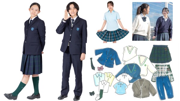紺ブレザー、リボン、チェックのスカートが基本スタイル。ブラウスは3色、セーター2色を選択。グレーカーディガンと紫のリボンもかわいいし、紺スラックスもかっこいい!自分の好みや気分に合わせて制服コーデを楽しめます。夏スカートは白ライン入り。ポロシャツは透けない生地で、かがんでも胸元が見えないような工夫も!ウエストのラインがしぼってあるため、着やせ効果も抜群です!