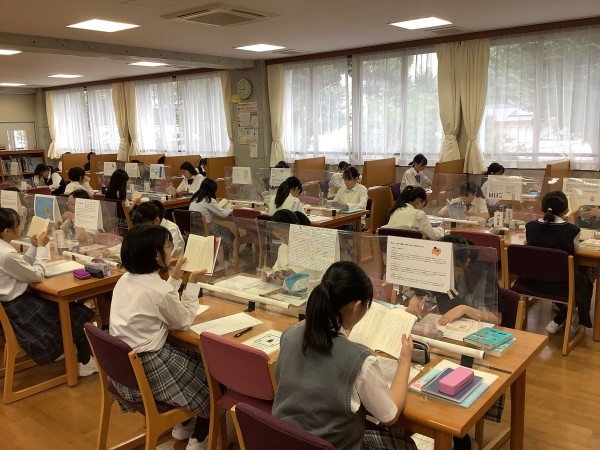 本をたくさん持っていても入れる自動ドアから入館すると、見渡せる高さのシックな書棚がたくさん並んでいます。目の前の窓から広がる緑は絵画のように美しいです。中1(国語)と中3(社会)読書の授業は「読書の三輪田」といわれる所以です。嬉しい床暖房です。奥の図書館講義室では高校生直木賞の活動も行っています。読書サークルは特別な空間の書庫で活動、夏合宿では4冊読み込みます。