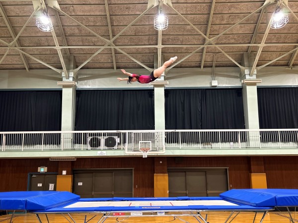 本校には中学校では珍しいトランポリン部があります。現在中高合わせて60名程所属しており,中学生からトランポリンを始めた生徒がほとんどです。週3回協力し合いながら練習に励んでいます。過去には全日本ジュニア選手権大会,全日本選手権大会等,全国レベルで活躍している生徒もおり,高校になるとインターハイに毎年出場している部活動です。本校見学の際には是非お尋ねください!