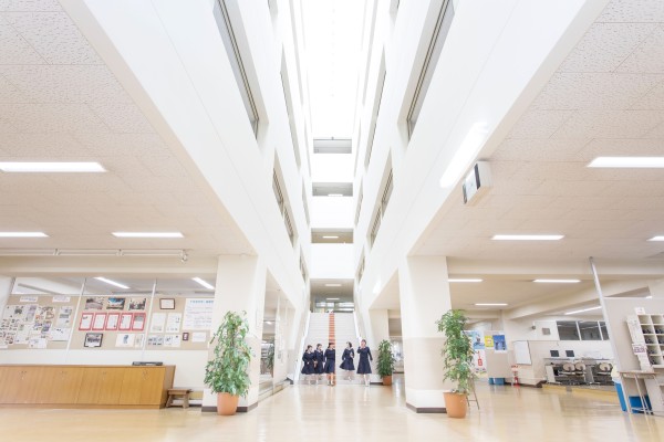 開放感抜群の吹き抜けの下でシンデレラ階段が生徒のみなさんをお迎えします。正面には鮮やかな緑色の人工芝の校庭が。メニュー豊富でアイスも買えるカフェテリアや室内にある温水プール。77000冊の蔵書を有する図書館。茶道や箏曲を学ぶ103畳の和室やオンライン英会話のためのcall教室など、最高の教育環境に恵まれた女子校です。