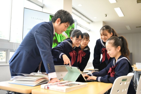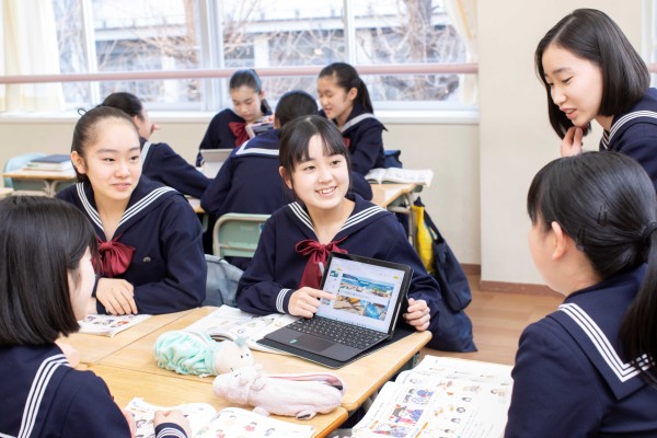 本校では全館Wi-Fi 完備となっており、生徒は一人1 台のパソコンを持っています。自分に合ったデバイスを持参し、「文房具のようにデバイスを使う」ことを方針としています(BYOD “Bring Your Own Device”)。そのため、授業や課題提出だけでなく委員会やクラブ活動など日常的に様々な場面で使用しています。