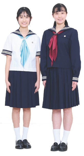中学のセーラ服は冬はエンジ色、夏はスクールカラーの水色のスカーフです。特に夏服は涼しげで在校生からもかわいいと人気があります。高校生の冬服はネクタイにブレザーのトラッドスタイル。オプションでチェックのスカートや紺のスラックスも選ぶことができます。白色のサマーセーターも導入され、さわやかな印象になりました。生徒たちからも人気です。