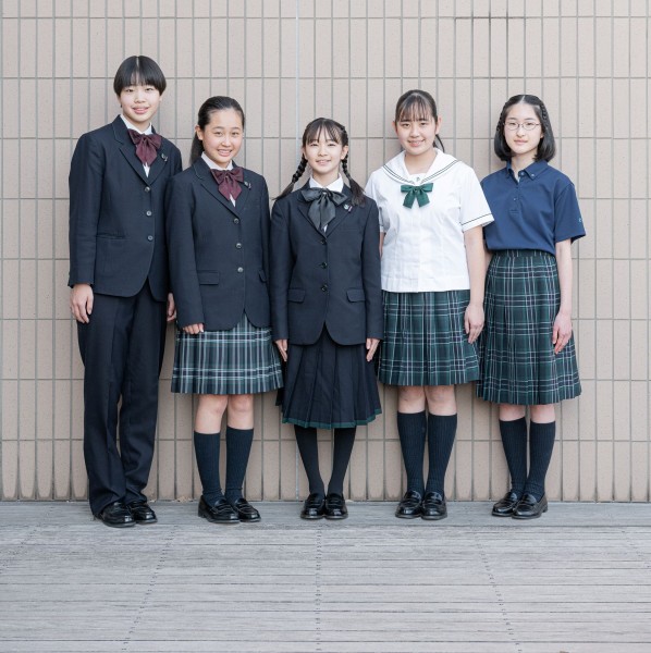 文京学院の制服は欲張りです。夏は「セーラー」、冬は「ブレザー」、気候や気分に合わせて、それぞれ組み合わせも楽しめます。ブレザーやスカートは、成長にあわせてサイズを調整し、6年間大切に着られるサスティナブルなデザインです。文京学院のイメージカラーである「グリーン」がアクセントとして配色されています。生徒たちの声に応えて、スラックスやリュックも導入しました。