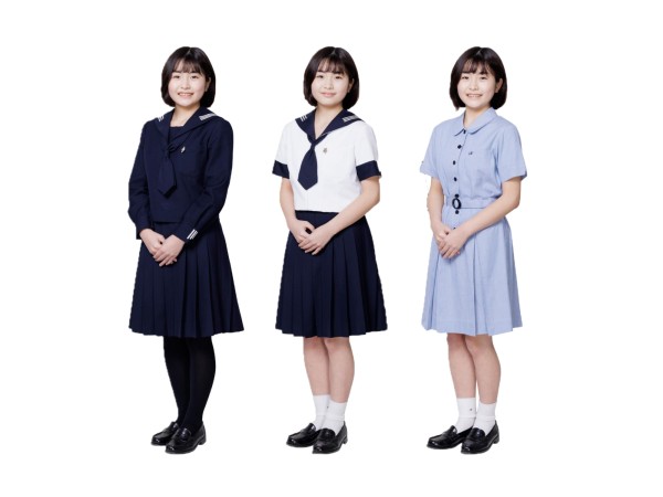 「川」をモチーフにした3本線のセーラー服は、創立当初から変わらないデザインです。着心地や着やすさを求めて、生地は改良を重ねてまいりました。夏の暑さ対策で考案された水色と白のストライプのワンピースは、家庭で洗濯できる上にノーアイロンで着られます。今年も生徒たちは、早い時期から好んで着始めていました。変化する気候や環境に対応し、常に生徒の快適さを追求しています。