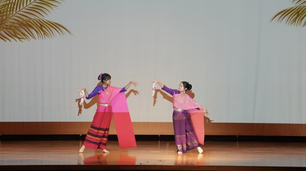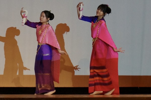 鮮やかな民族衣装を着た二人が壇上に上がると大きな歓声が上がり、2 人からはダンスの説明が行われました。その後、実際の演舞が行われ、優雅な演舞により講堂はアジアのエスニックな雰囲気に包まれ、演舞の後には大きな拍手が送られました。留学生2人への関心はもちろん、彼女たちの母国への関心も大いに高まる素敵なイベントとなりました。