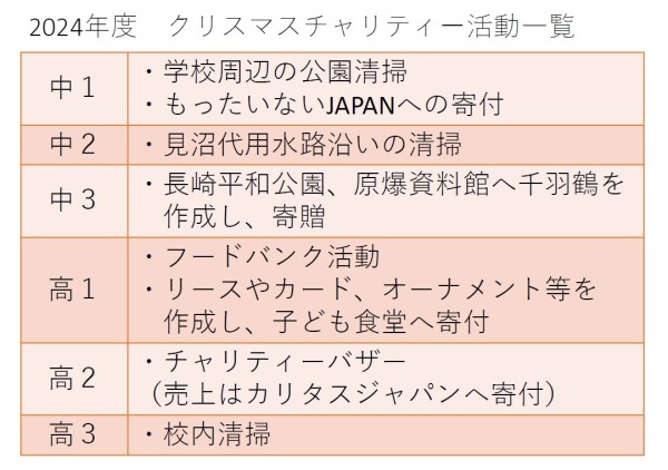 2024年度もクリスマス行事では、各学年のHR委員会を中心として、さまざまな活動を行いました。あわせて社会奉仕委員会の呼び掛けでプレゼントを持ち寄り、学校周辺にあるさまざまな施設に届ける活動も行いました。また文化祭では図書委員会中心となって古本を持ち寄り、古本市を開催しました。こちらも売り上げを点字図書館に寄付させていただきました。