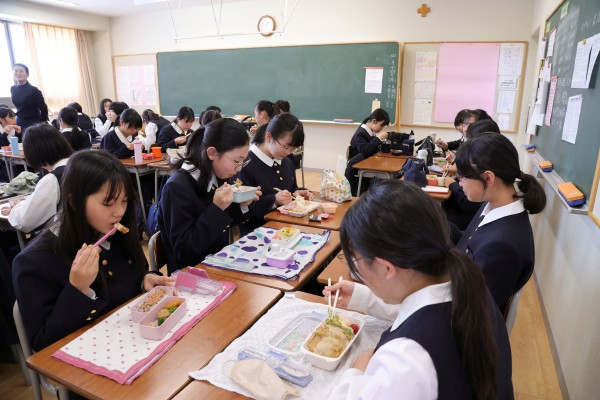 中学生はお弁当を教室で食べます。お弁当は当日の朝、カフェテリアで作った日替わり弁当(\470‐)を注文することもできます。前の週にメニュー表が教室に掲示されるため、メニューによっては申し合わせて注文する様子も見ることができます。また、高校生になるとカフェテリアで食べることもできます。